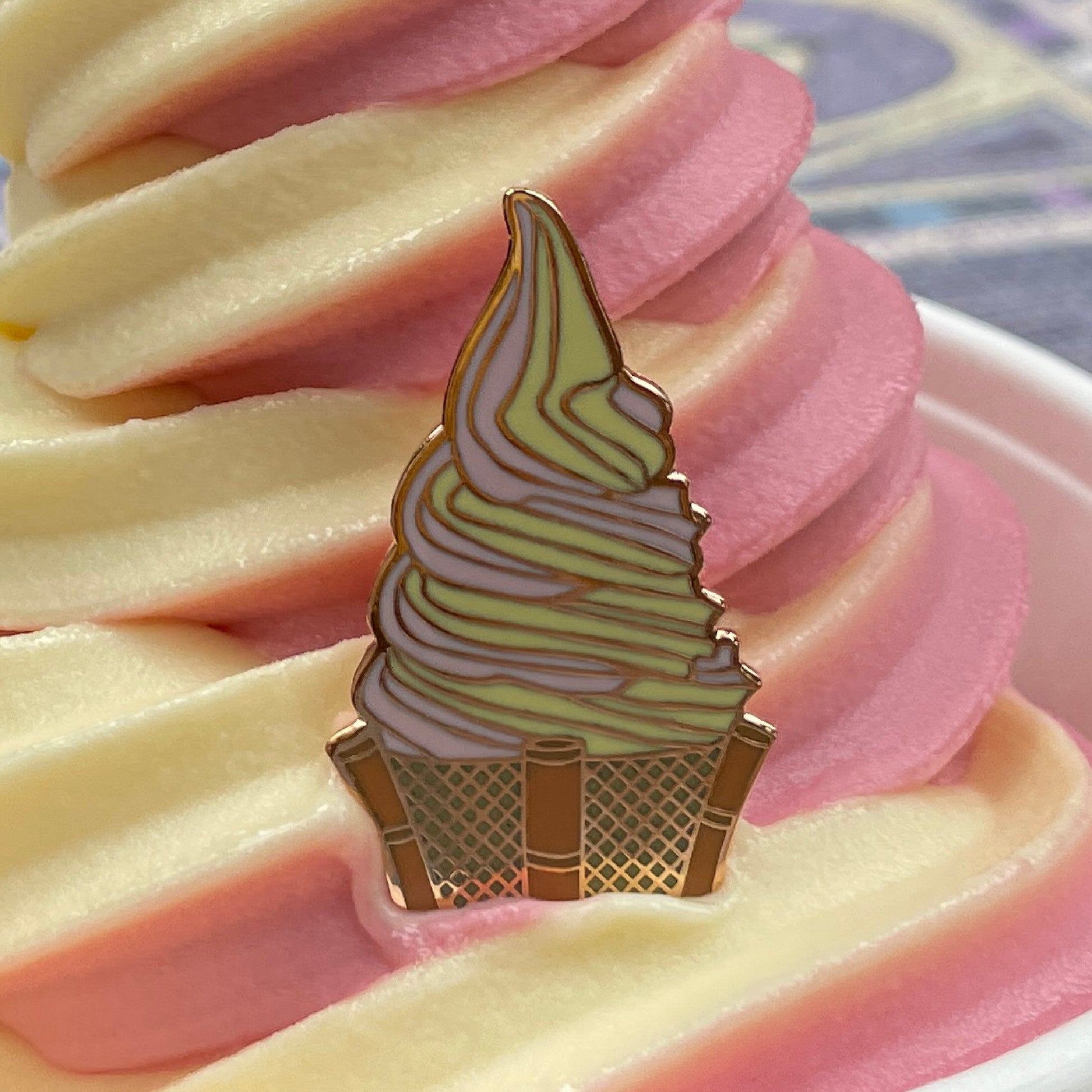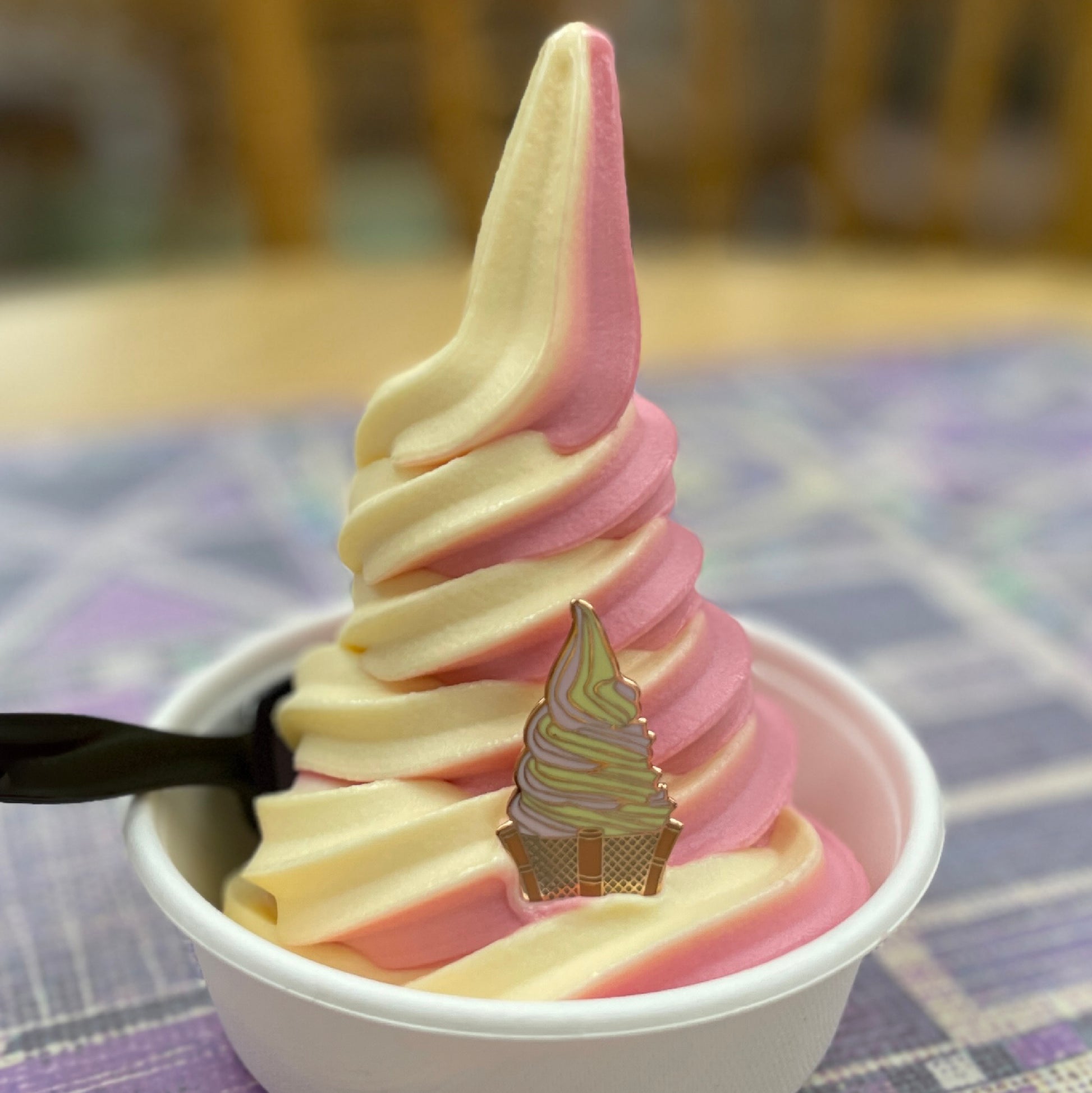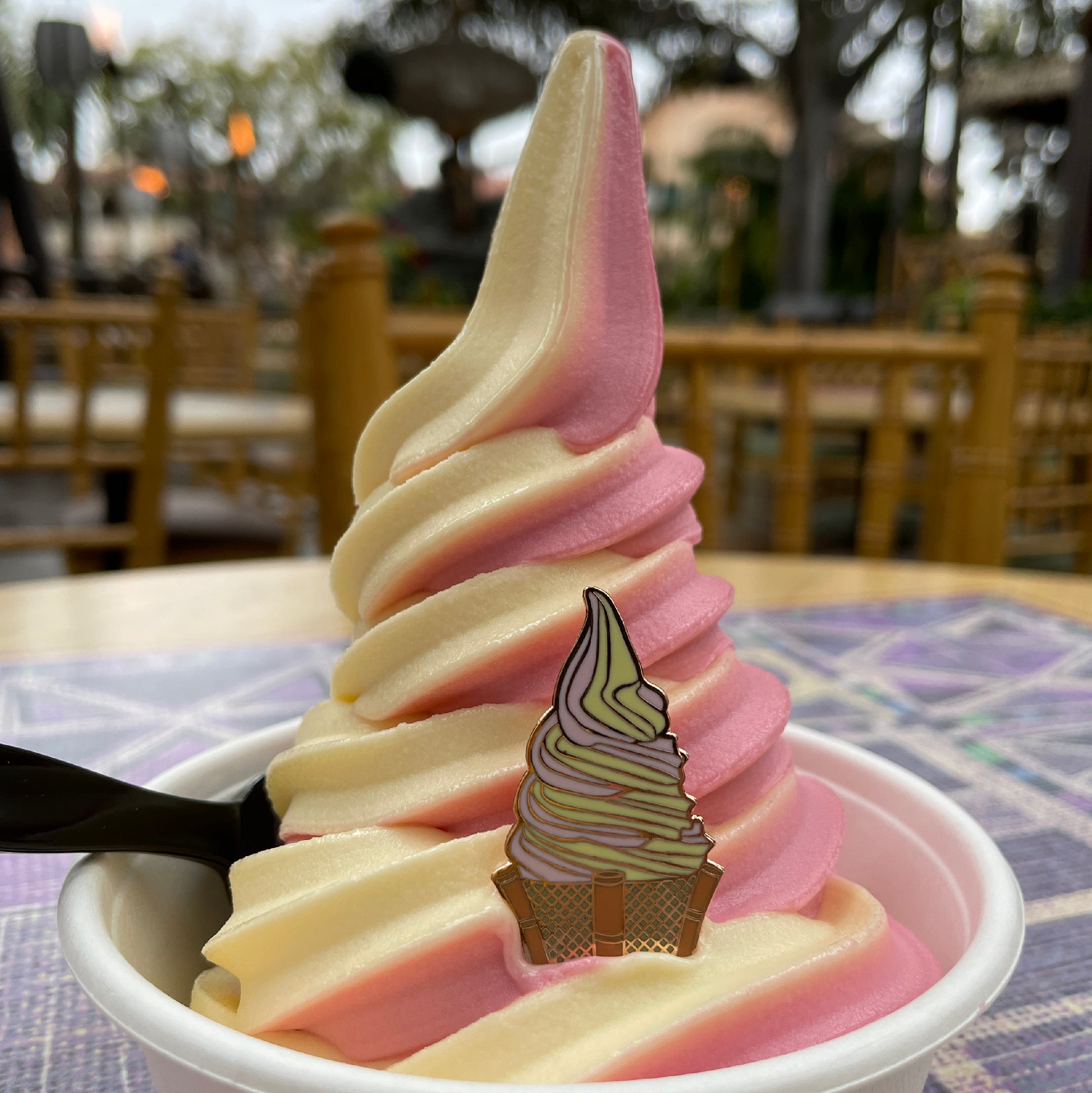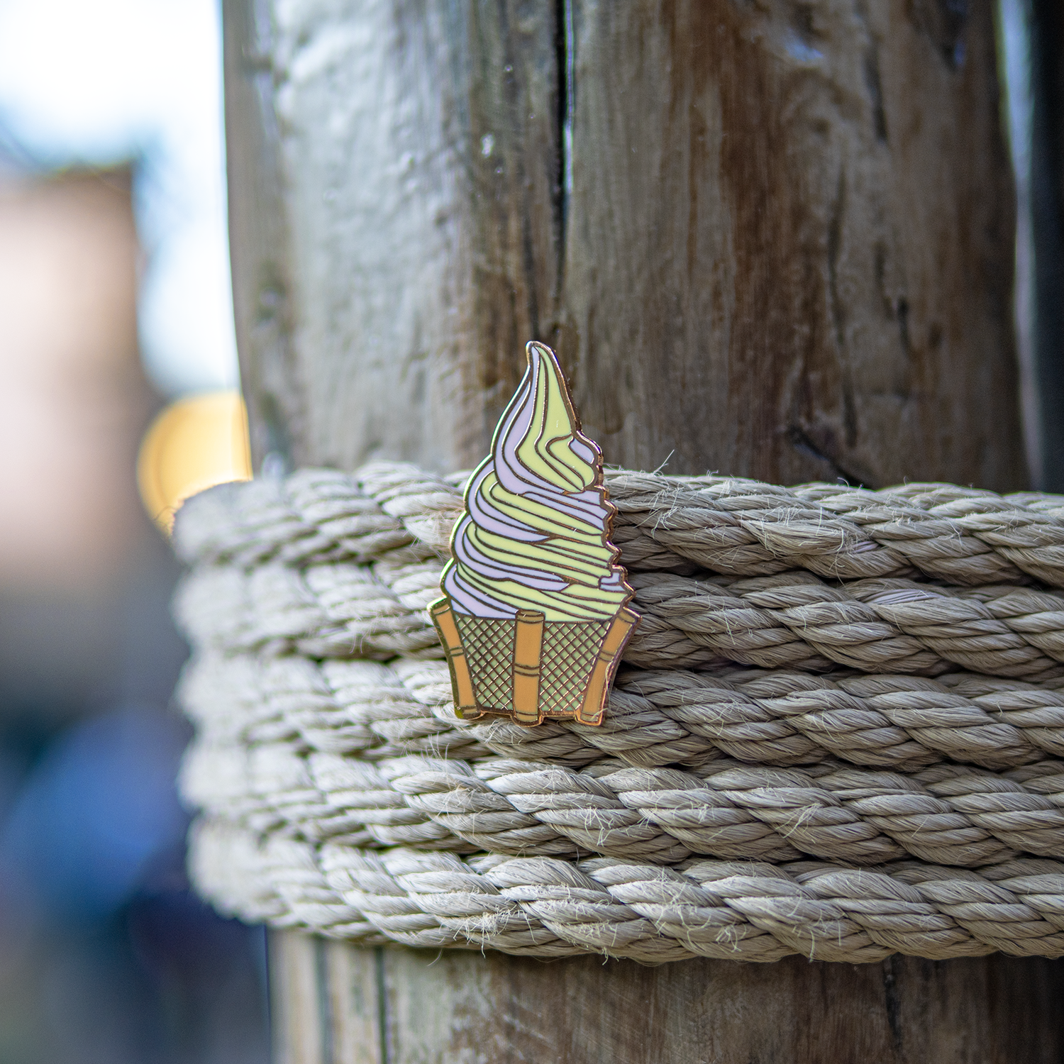 Choose this two-tone swirl to rep your favorite flavor with this Tiki Whip pin. Inspired by the Strawberry (or Watermelon, they're both a very light pink and I don't remember which one has been at The Hideaway longer) Pineapple Swirl of our favorite non-dairy soft-serve snack. The Hard Enamel Pin is 40MM Tall (1.57 Inches) and features Rose Gold Metal Plating.