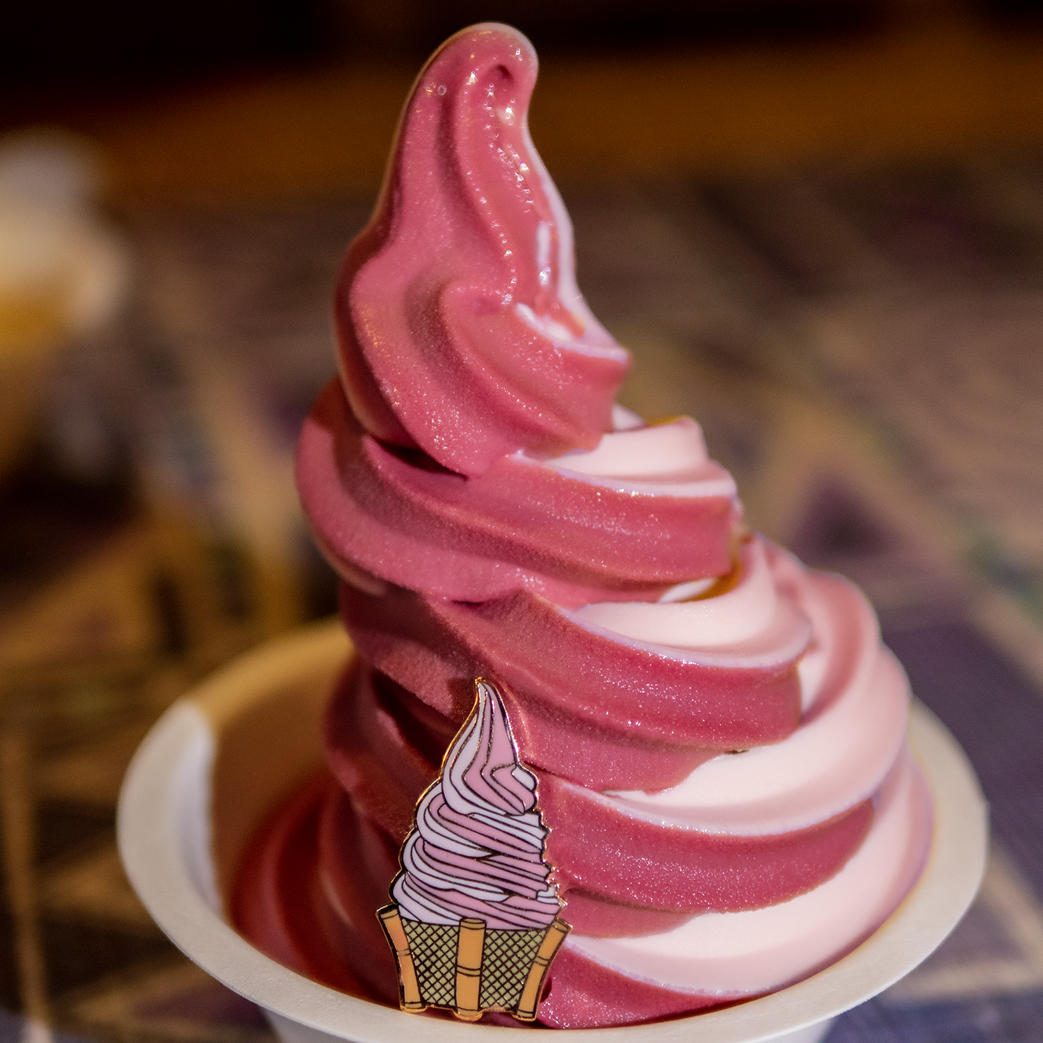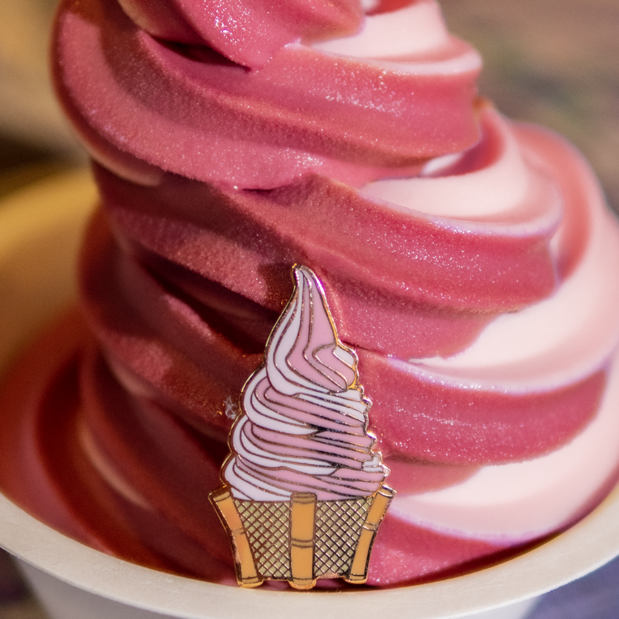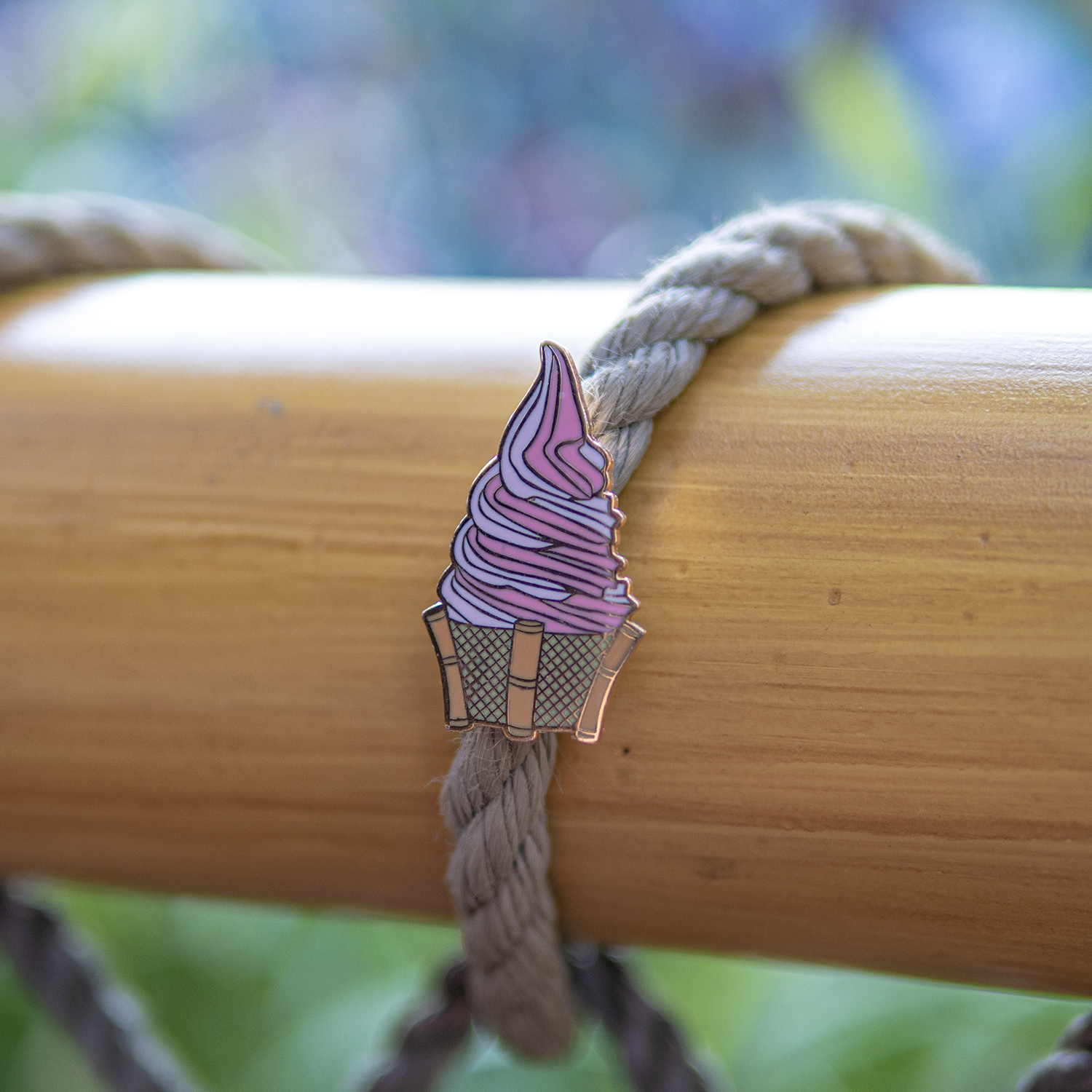 Choose this two-tone swirl to rep your favorite flavor with this Tiki Whip pin. Inspired by the Cherry Strawberry "Valentine Swirl" of the iconic theme park soft-serve snack. The Hard Enamel Pin is 40MM Tall (1.57 Inches) and features Rose Gold Metal Plating.