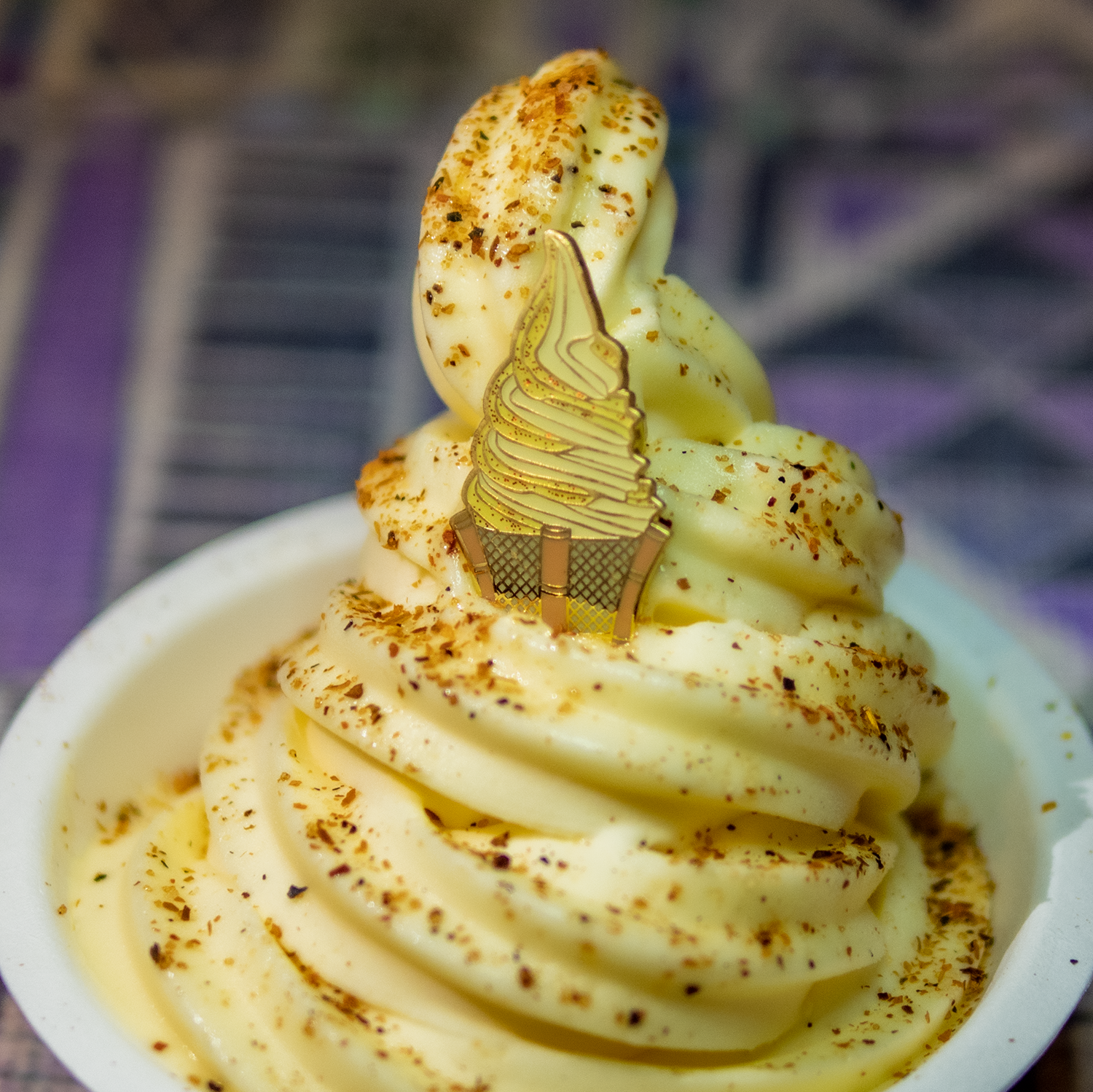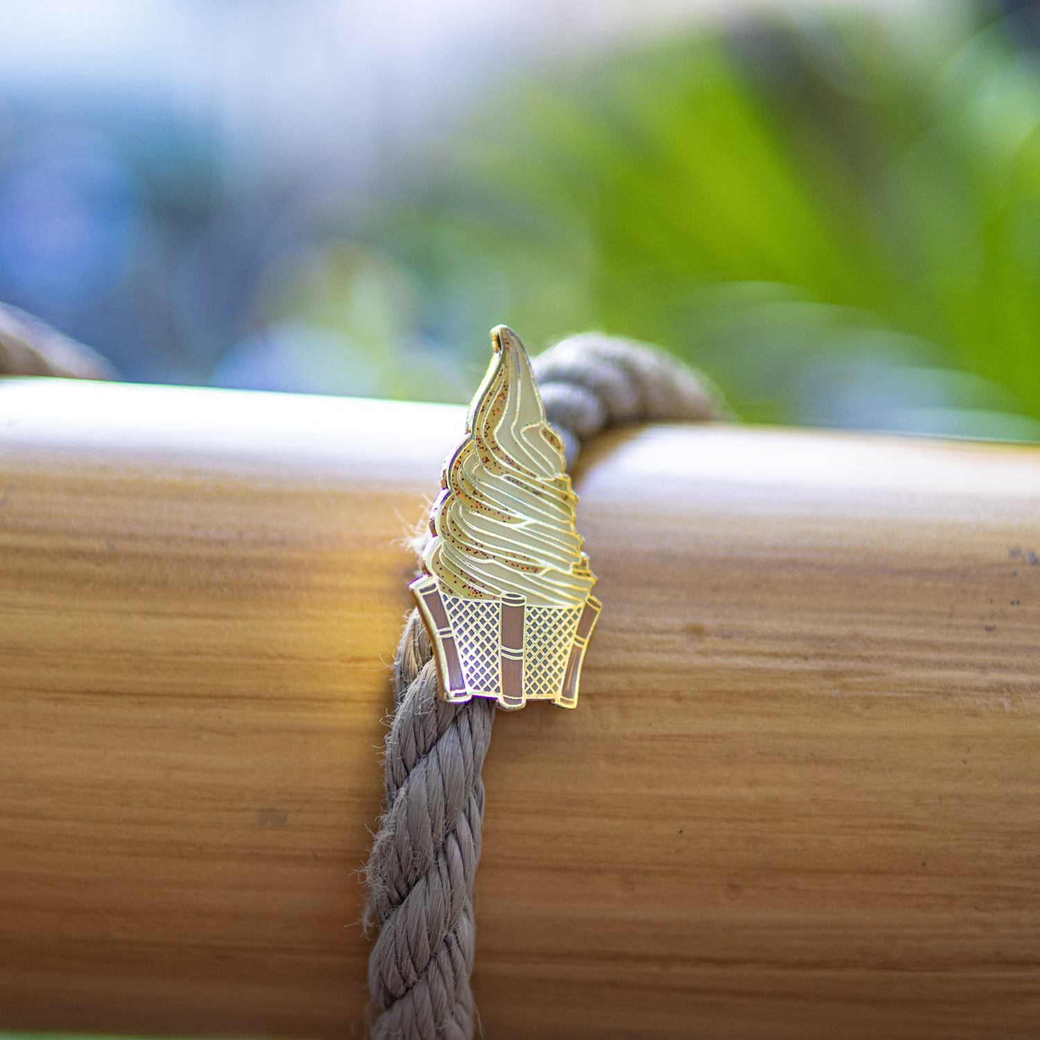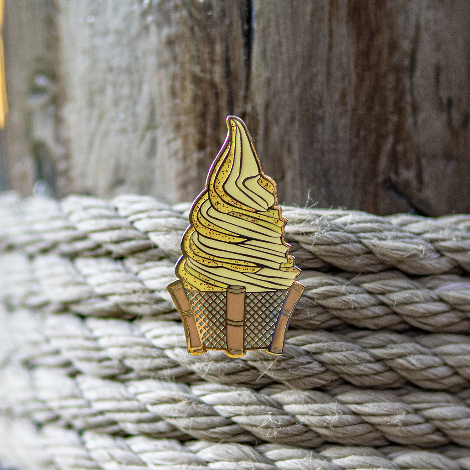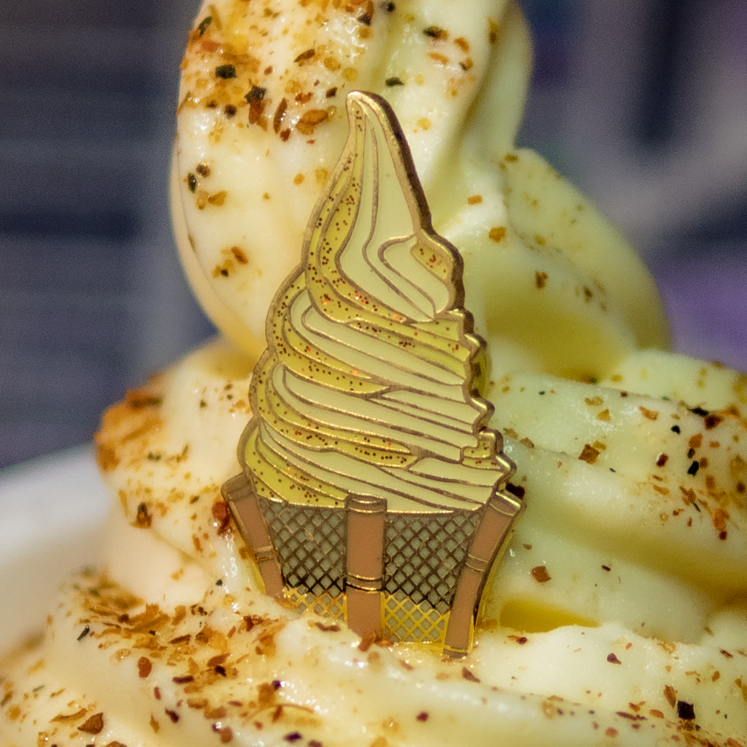The iconic Tiki Whip pin in a new California-favorite twist. There's nothing quite as tasty as sprinkling on some spicy chili lime powder to plus the flavor of our favorite non-dairy soft-serve snack. The Hard Enamel Pin is 40MM Tall (1.57 Inches) and features Red Glitter and Rose Gold Metal Plating.