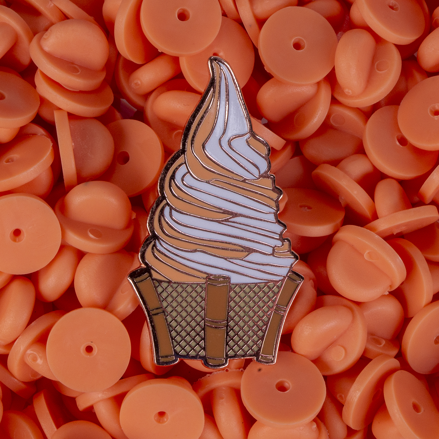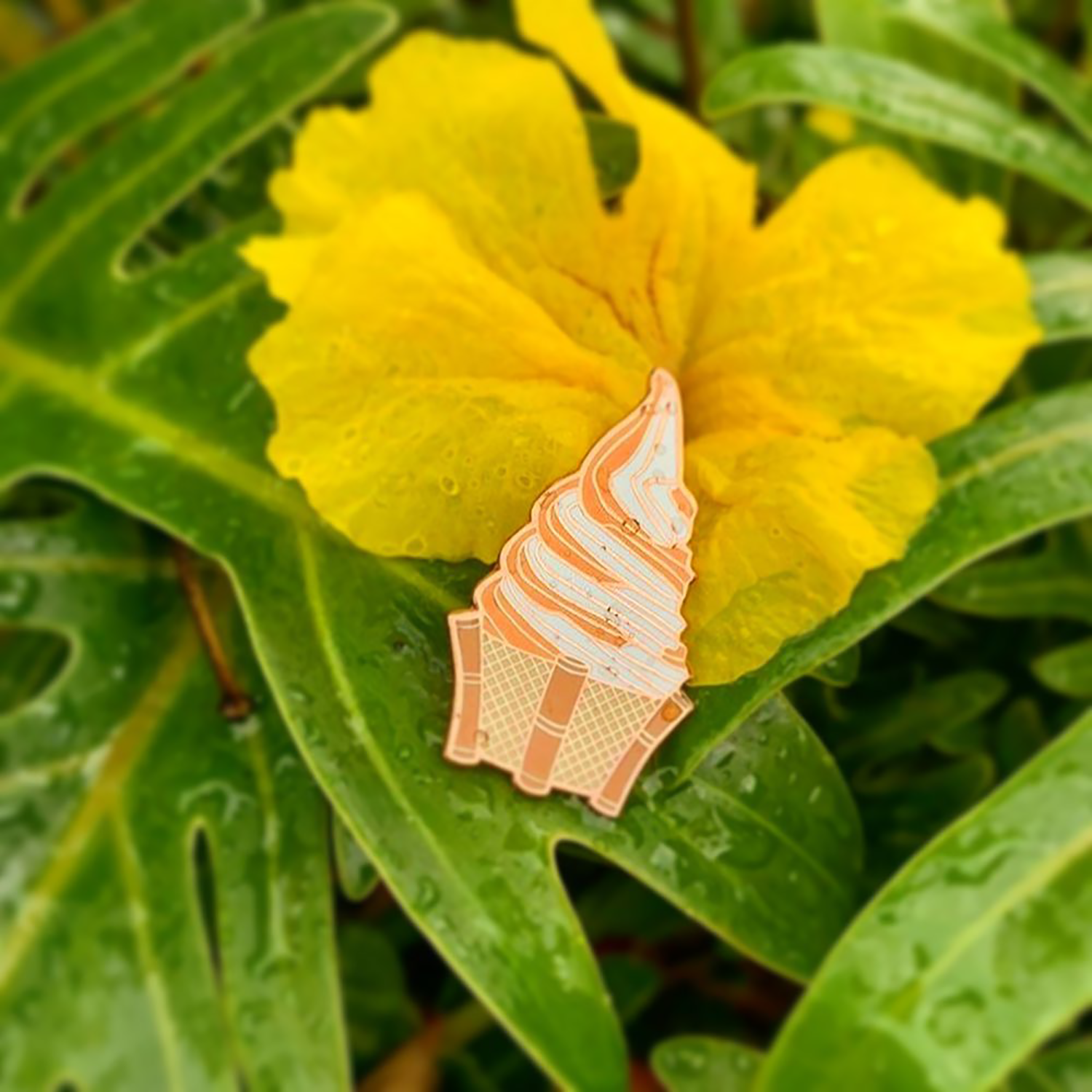 Choose this two-tone swirl to rep your favorite flavor with this Tiki Whip pin. Inspired by the Orange Vanilla Swirl of the iconic theme park soft-serve snack. The Hard Enamel Pin is 40MM Tall (1.57 Inches) and features Gold Metal Plating.
