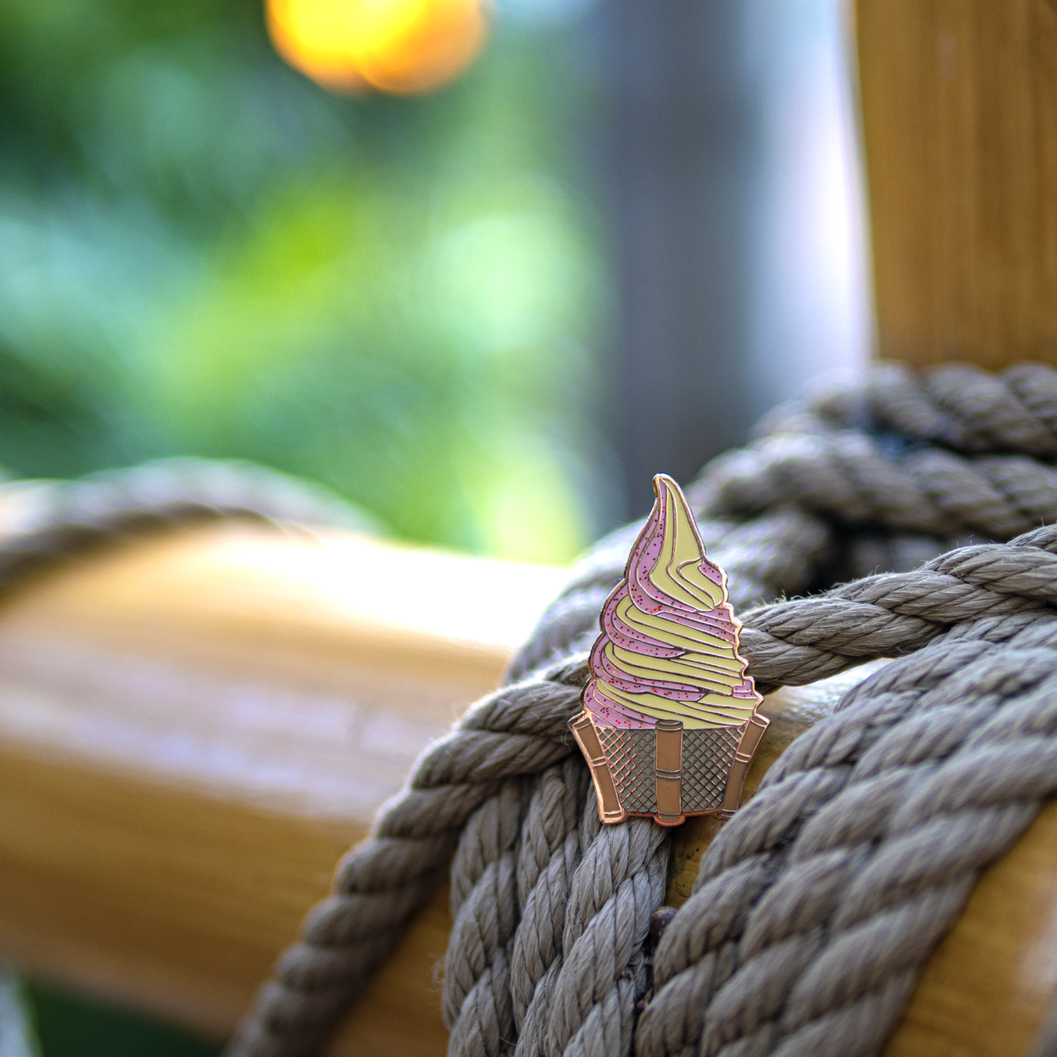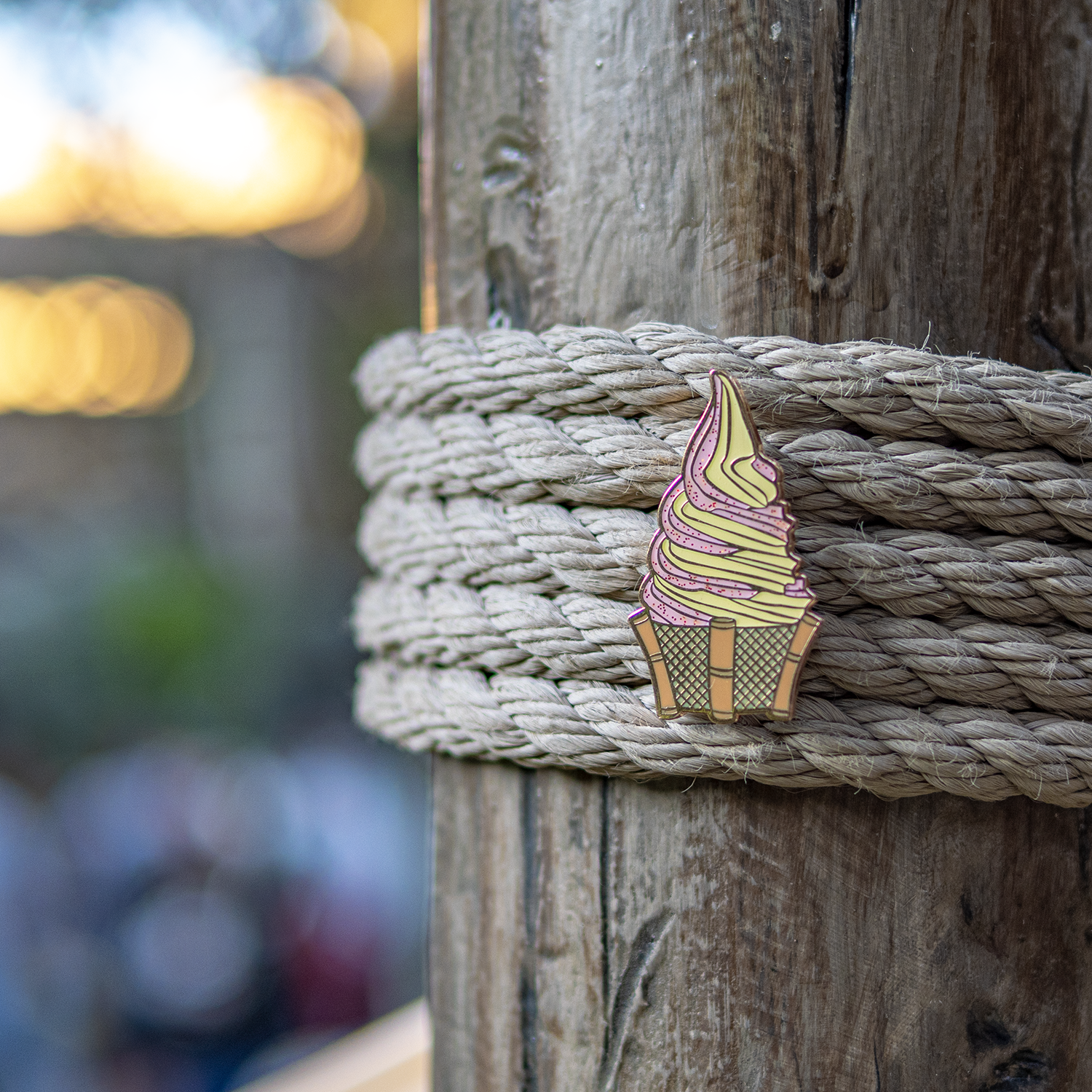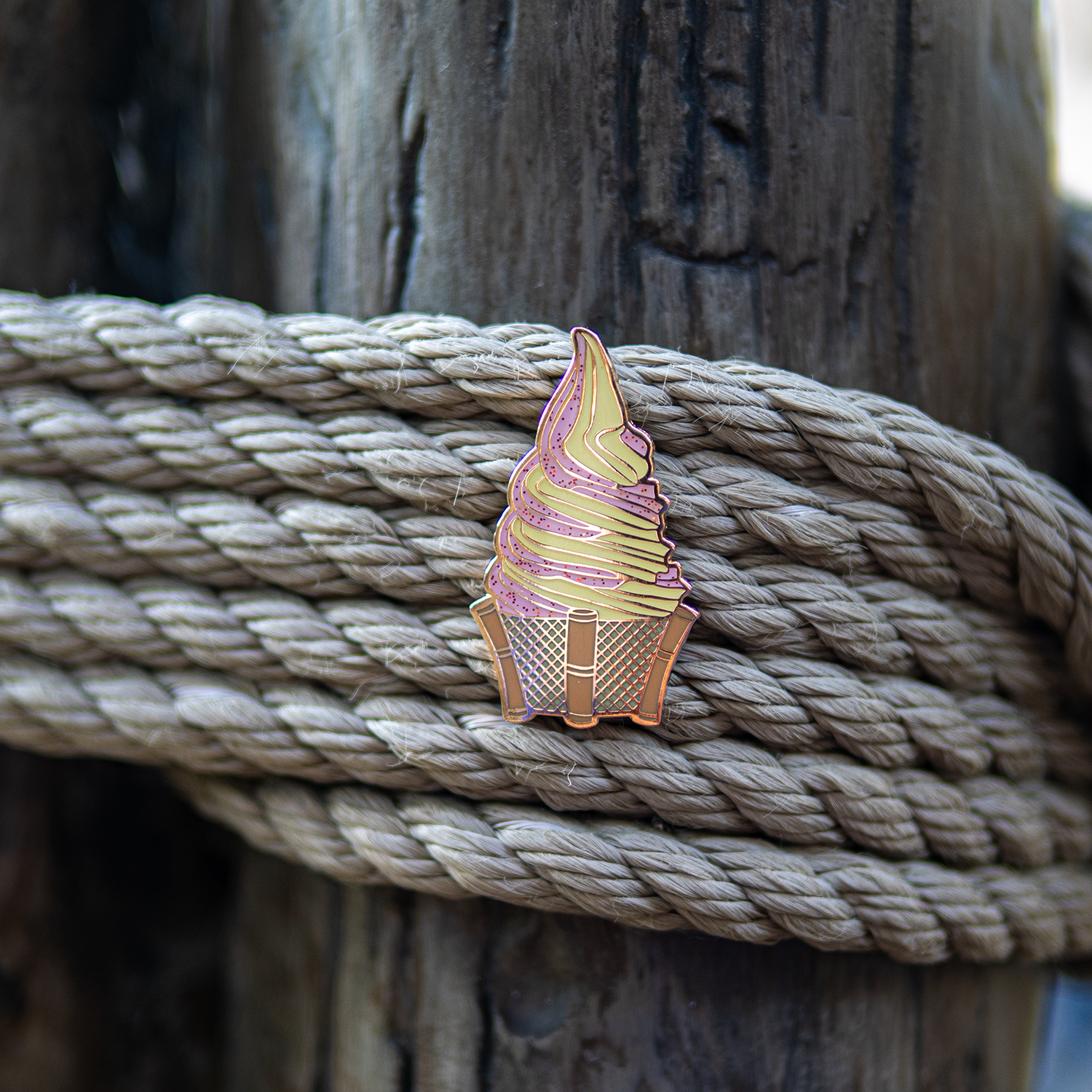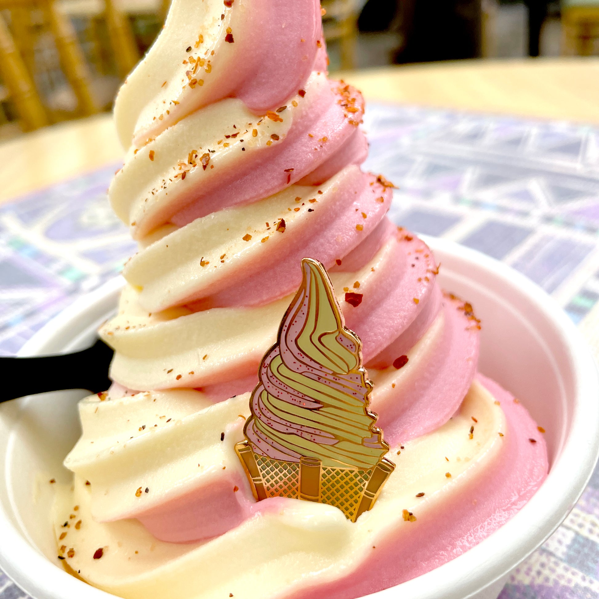 The iconic Tiki Whip pin in a new California-favorite twist. There's nothing quite as tasty as sprinkling on some spicy chili lime powder to plus the flavor of our favorite non-dairy soft-serve snack. The Hard Enamel Pin is 40MM Tall (1.57 Inches) and features Red Glitter and Rose Gold Metal Plating.